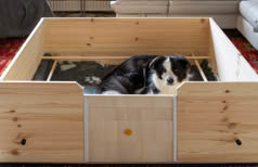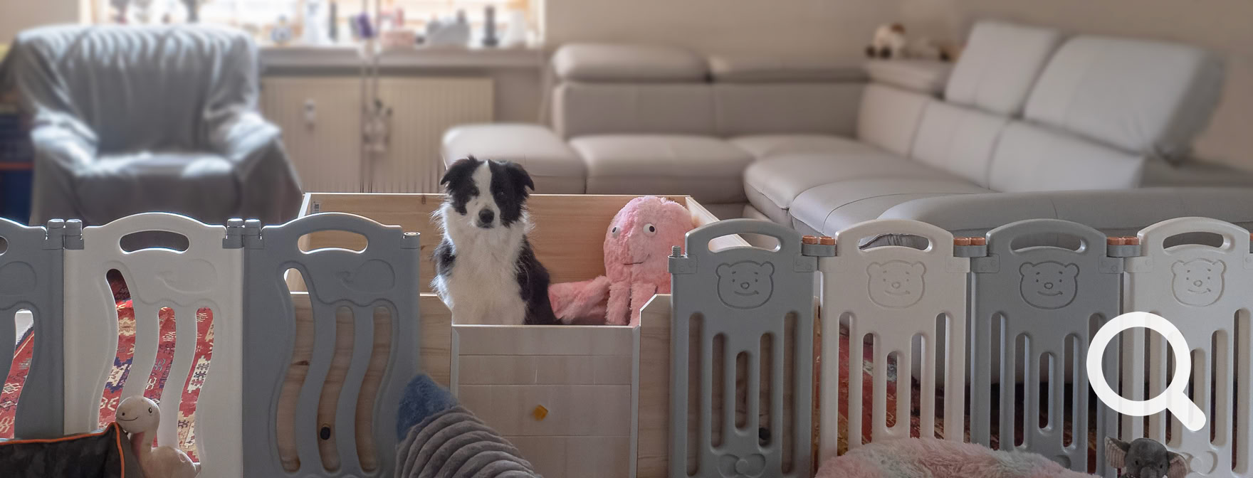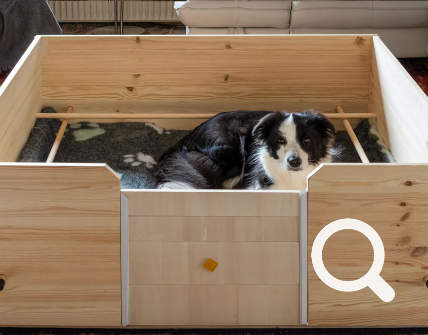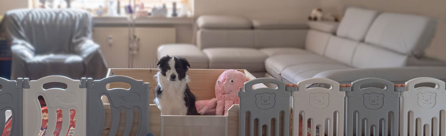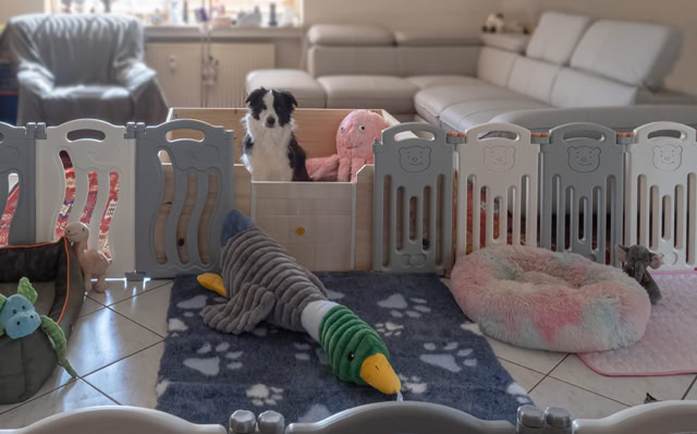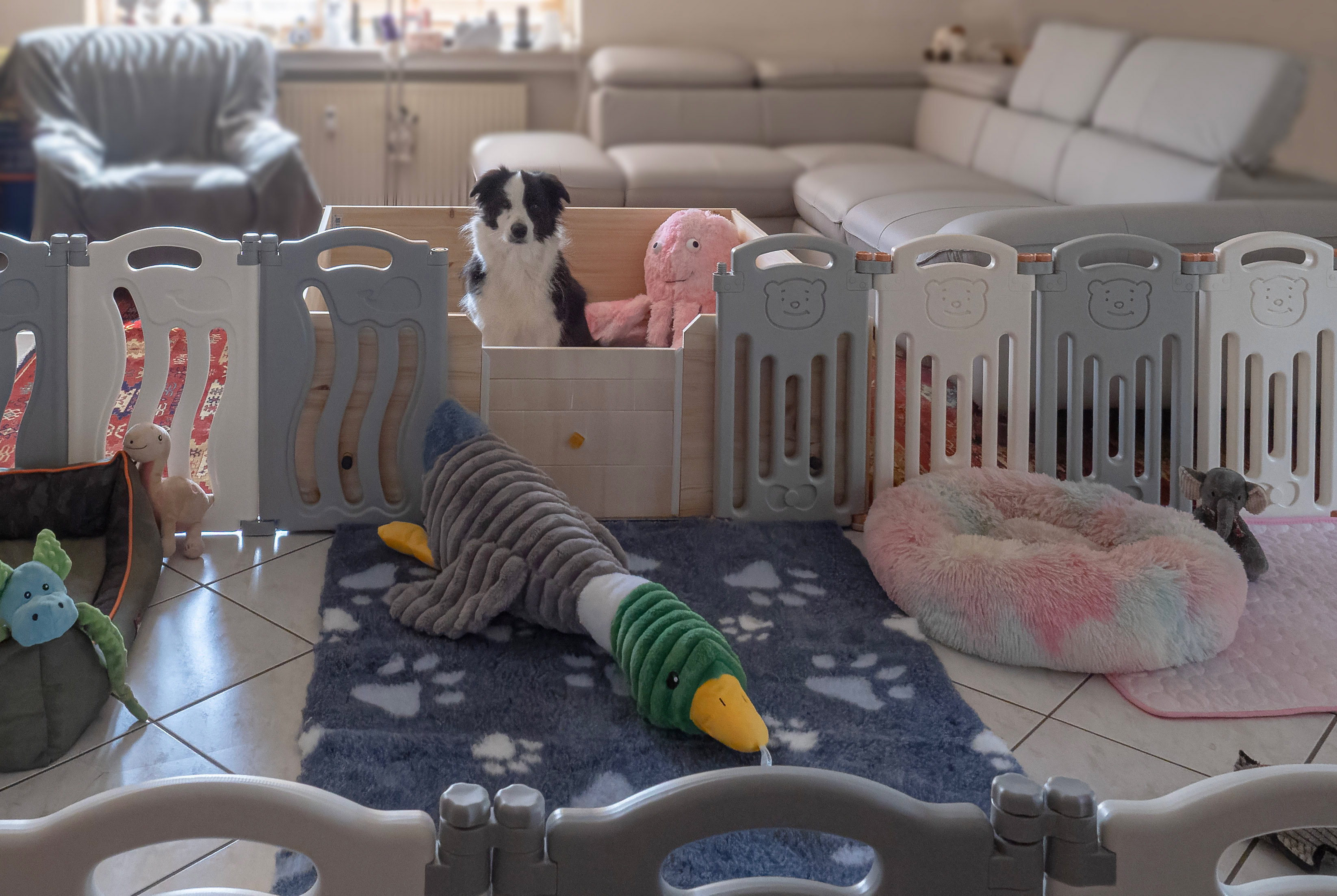 Sobald sie ihre Wurfbox verlassen können, erkunden sie das große Welpenzimmer, welches mit verschiedenstem Spielzeug und Liegeplätzen ausgestattet ist. Später haben sie auch Zugang zur Küche und zum Garten.