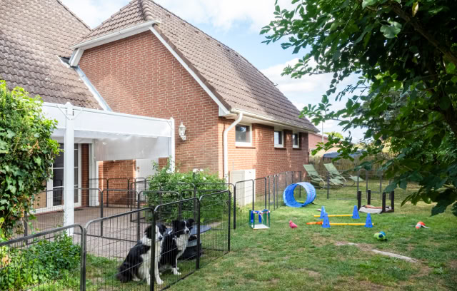 Im Welpenauslauf im Garten gibt es für die Kleinen viel zu entdecken – Terrasse und Garten sind großzügig Welpensicher eingezäunt. Wippe, Schaukeln, Sandkiste, Bällebad, Tunnel und Spielzeug runden das Erlebnisparadis ab.