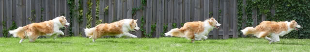 Die Bewegung soll frei, fließend und unermüdlich sein, wobei die Pfoten möglichst wenig angehoben werden, damit sich der Hund schleichend und mit grosser Geschwindigkeit bewegen kann.Rute