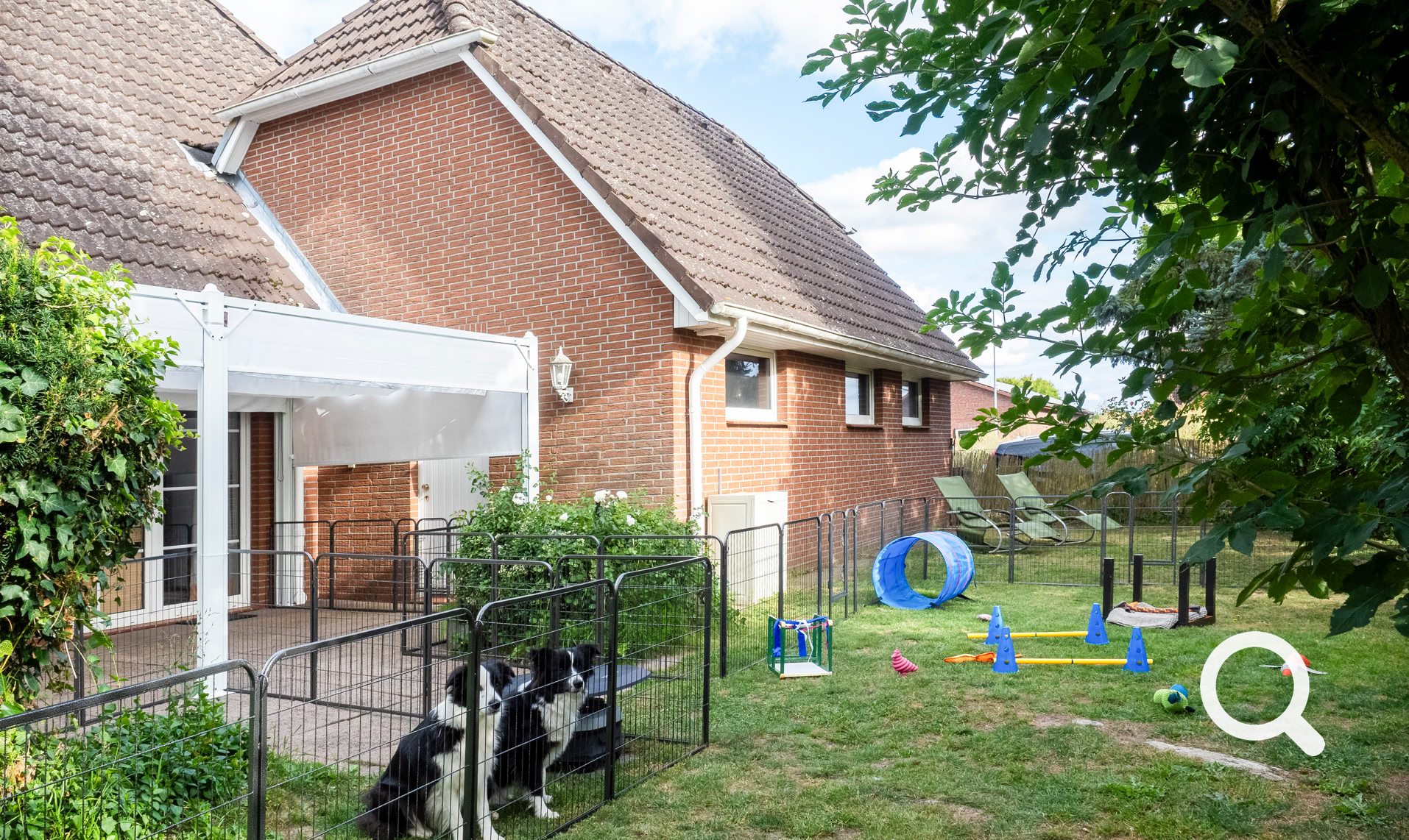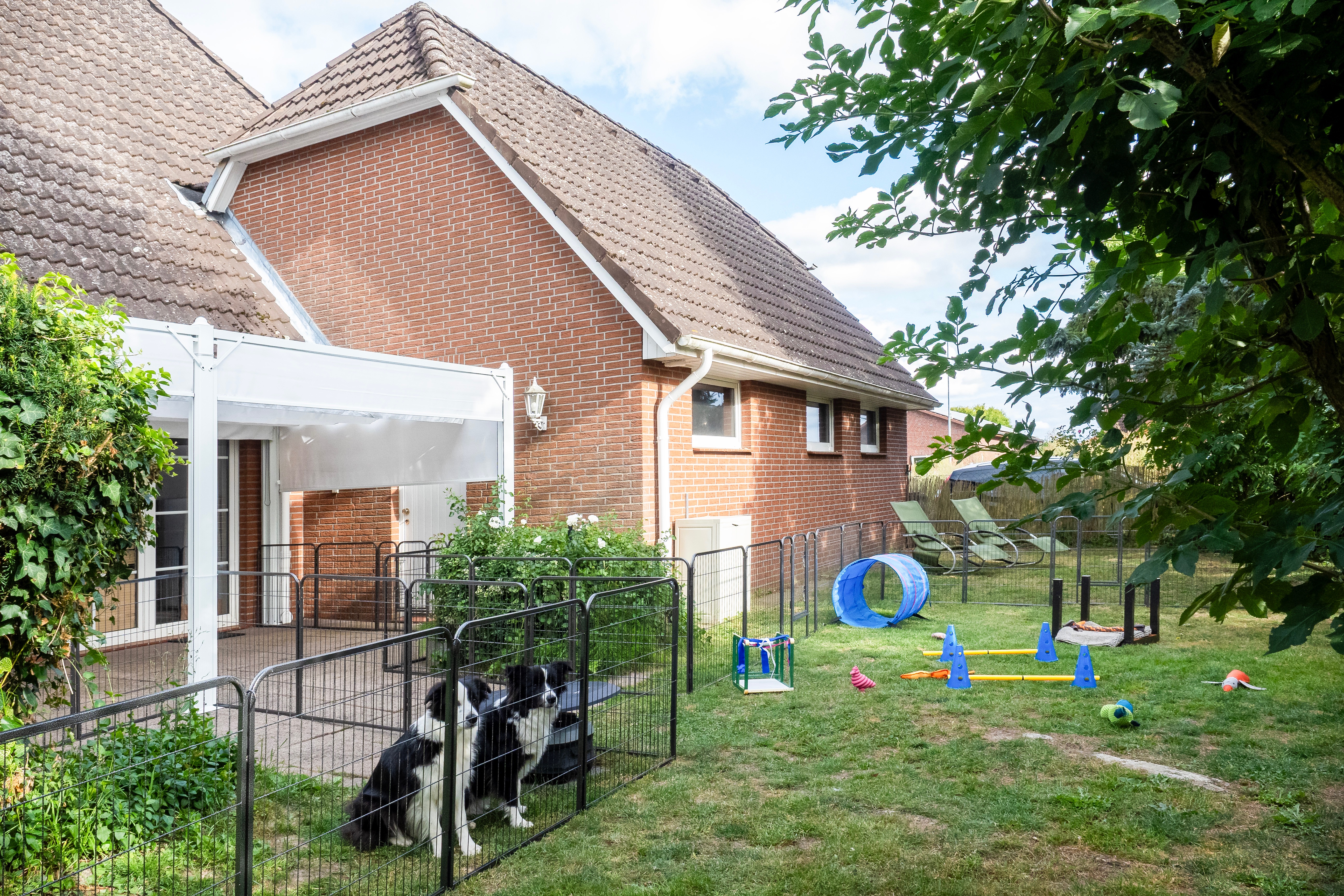 Im Welpenauslauf im Garten gibt es für die Kleinen viel zu entdecken – Terrasse und Garten sind großzügig Welpensicher eingezäunt. Wippe, Schaukeln, Sandkiste, Bällebad, Tunnel und Spielzeug runden das Erlebnisparadis ab.