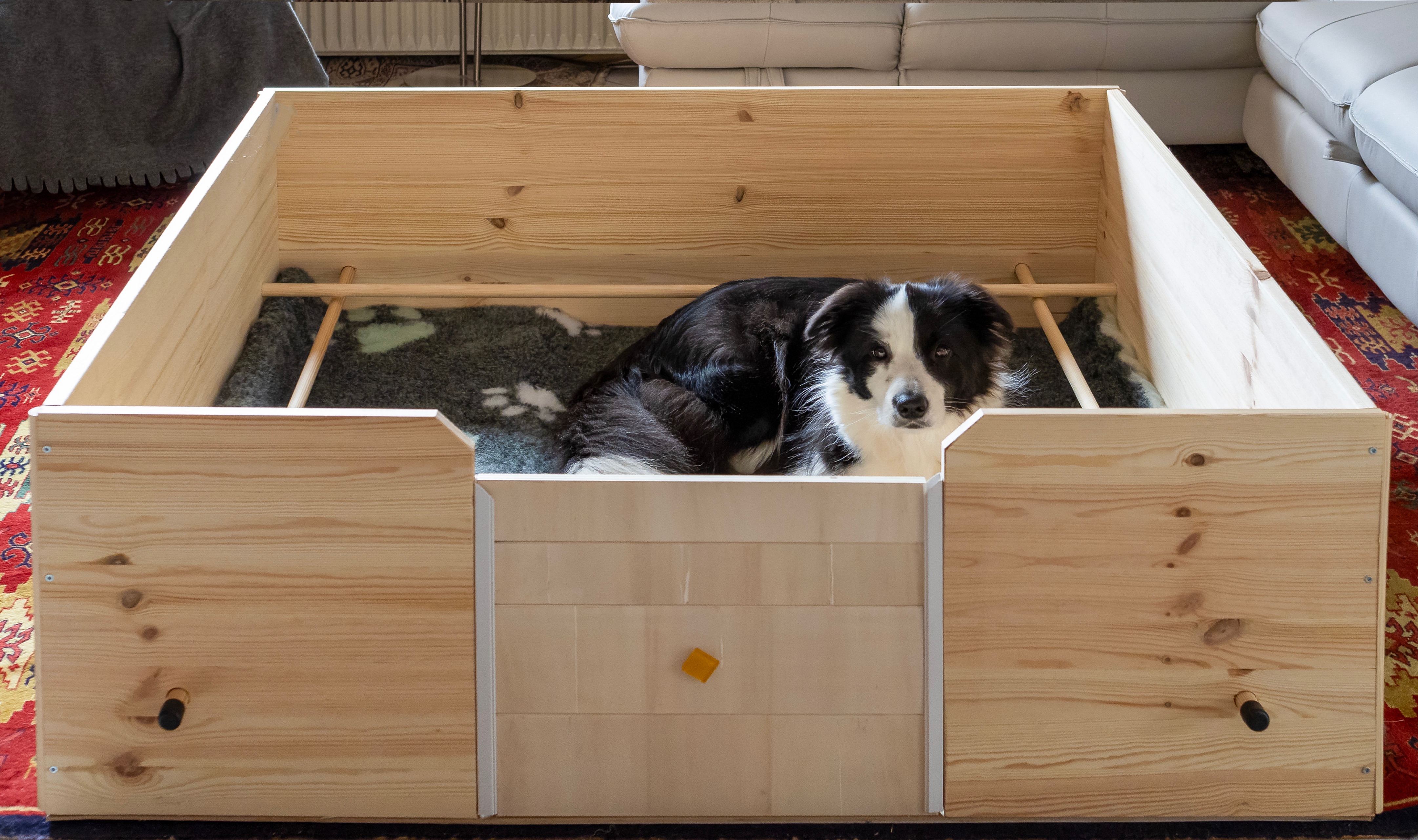 Sobald sie ihre Wurfbox verlassen können, erkunden sie das große Welpenzimmer, welches mit verschiedenstem Spielzeug und Liegeplätzen ausgestattet ist. Später haben sie auch Zugang zur Küche und zum Garten.